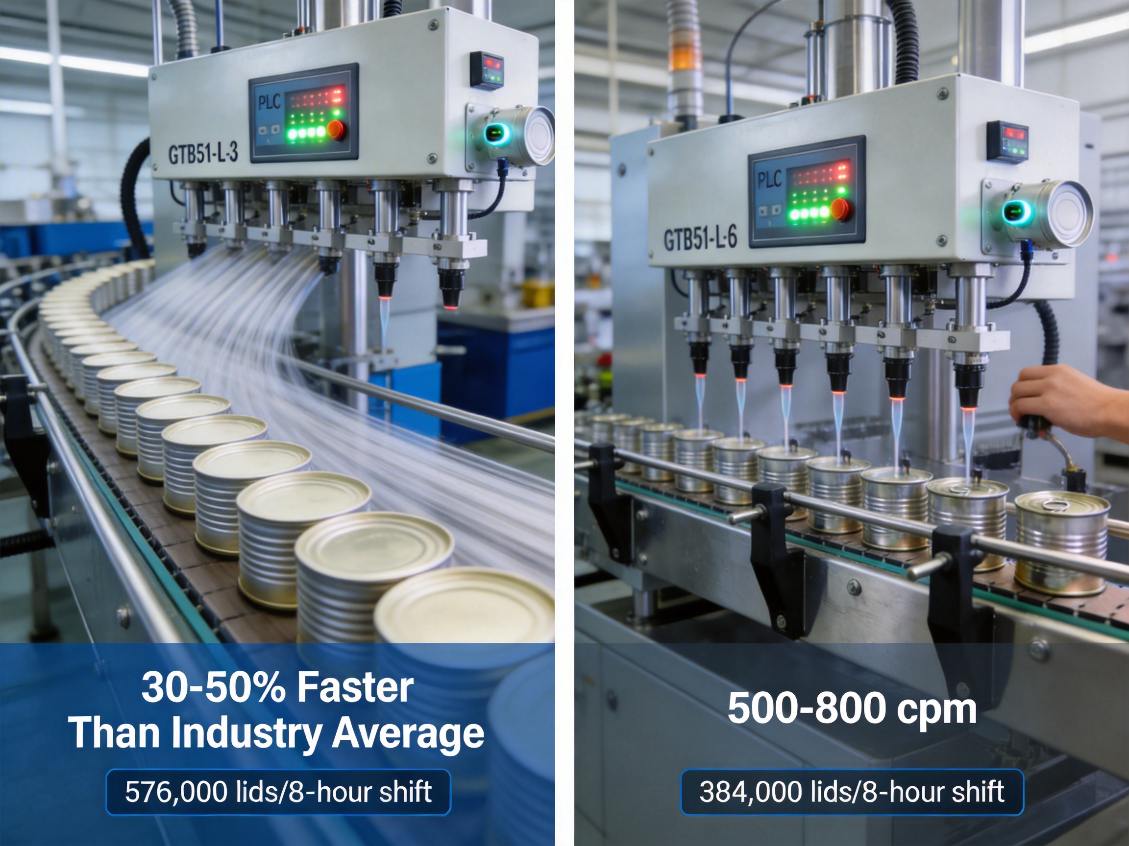 A2: The GT3B51-L-3 model operates at 800-1200 cans per minute (cpm), which is 30-50% faster than the industry average of 500-800 cpm for similar lid size ranges. This higher speed translates to a significant increase in production throughput—up to 576,000 lids per 8-hour shift—reducing per-unit production costs and increasing profitability.