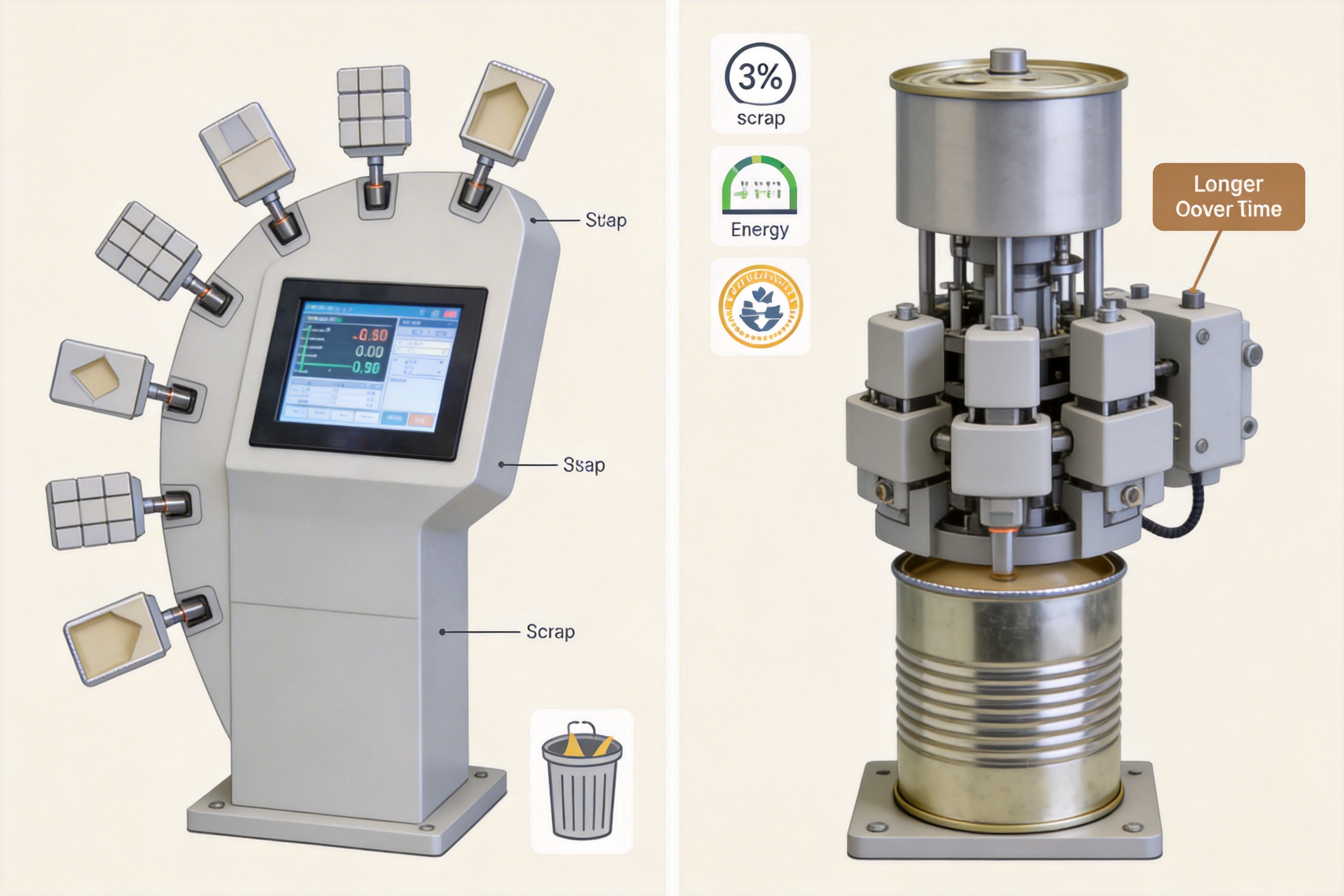 Waste reduction is a top priority for can manufacturers, as raw materials (especially tinplate) are costly and sustainability goals are increasingly stringent. The machine’s precision forming and quick changeover time cut scrap by 30% compared to average competitors. For example, a producer of oval jam cans that previously generated 15% waste now sees only 3% waste after adopting this machine. Additionally, optimized servo drives and regenerative braking systems reduce energy consumption by 20% (15–20 kW/h vs. 22–25 kW/h for competitors), lowering operational costs and carbon footprint.
