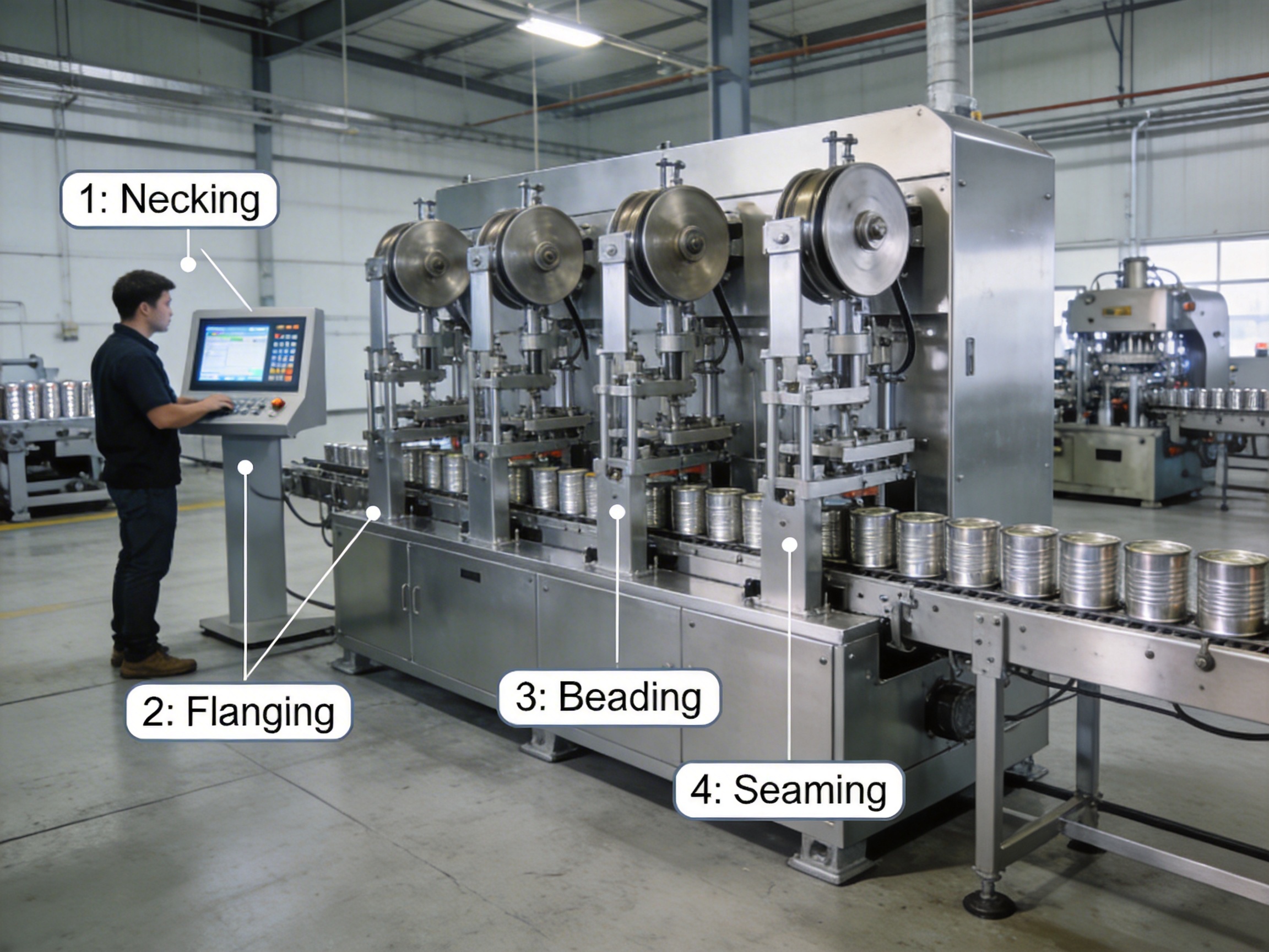 Each station operates in perfect synchronization, with automated material handling between stages. Once a can body enters the machine, it undergoes all four processes in a continuous flow, emerging as a finished, sealed can ready for filling. This eliminates manual transfer between machines, reducing labor costs and human error risk.