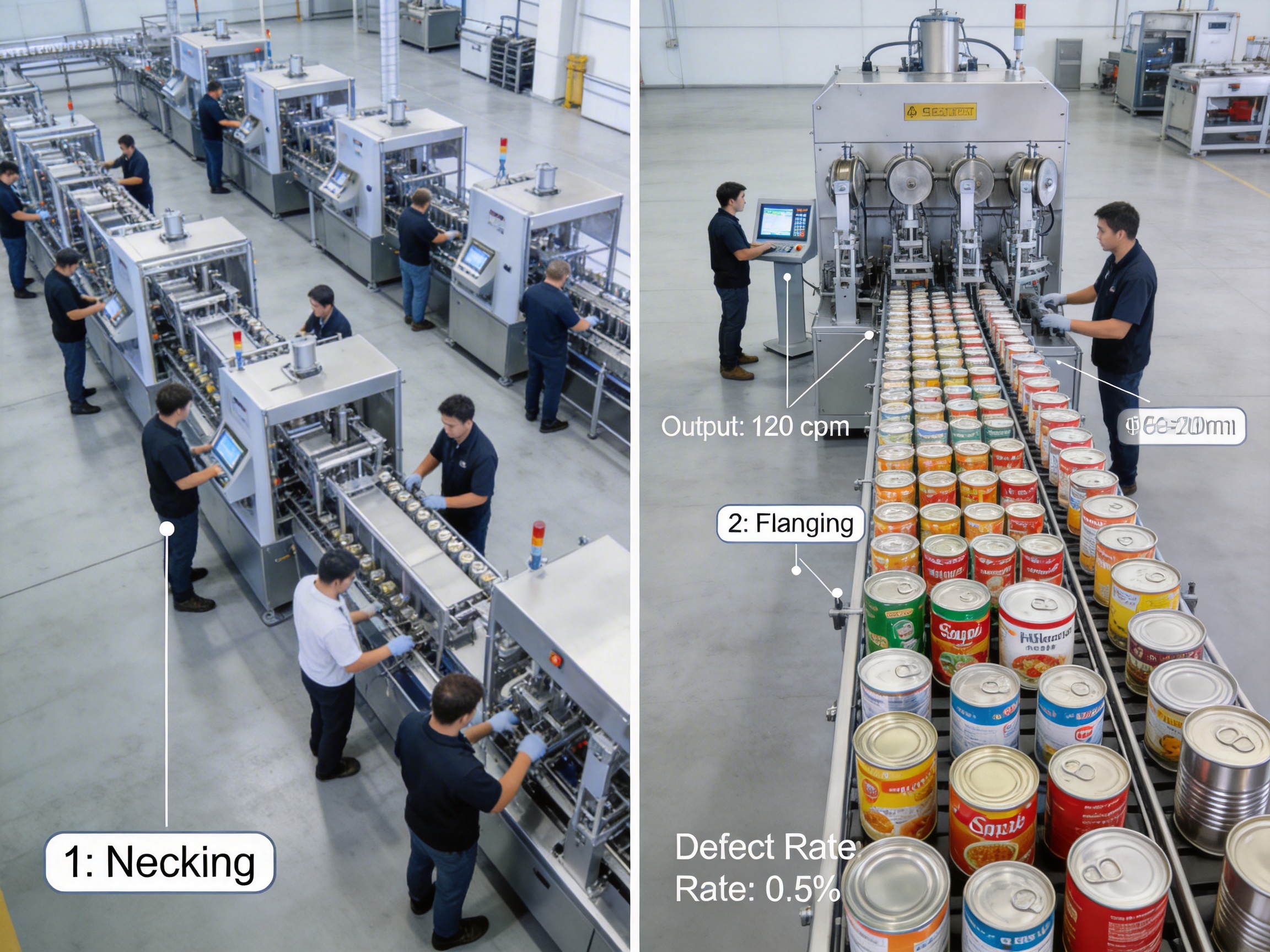 A European soup maker needed large cans (Φ99mm) with thick materials. Customizations included modified necking and integrated lid inspection: - 100% defect-free large cans. - Output up20%:100 cpm for large cans. - EU compliance: Meets FDA/CE standards.