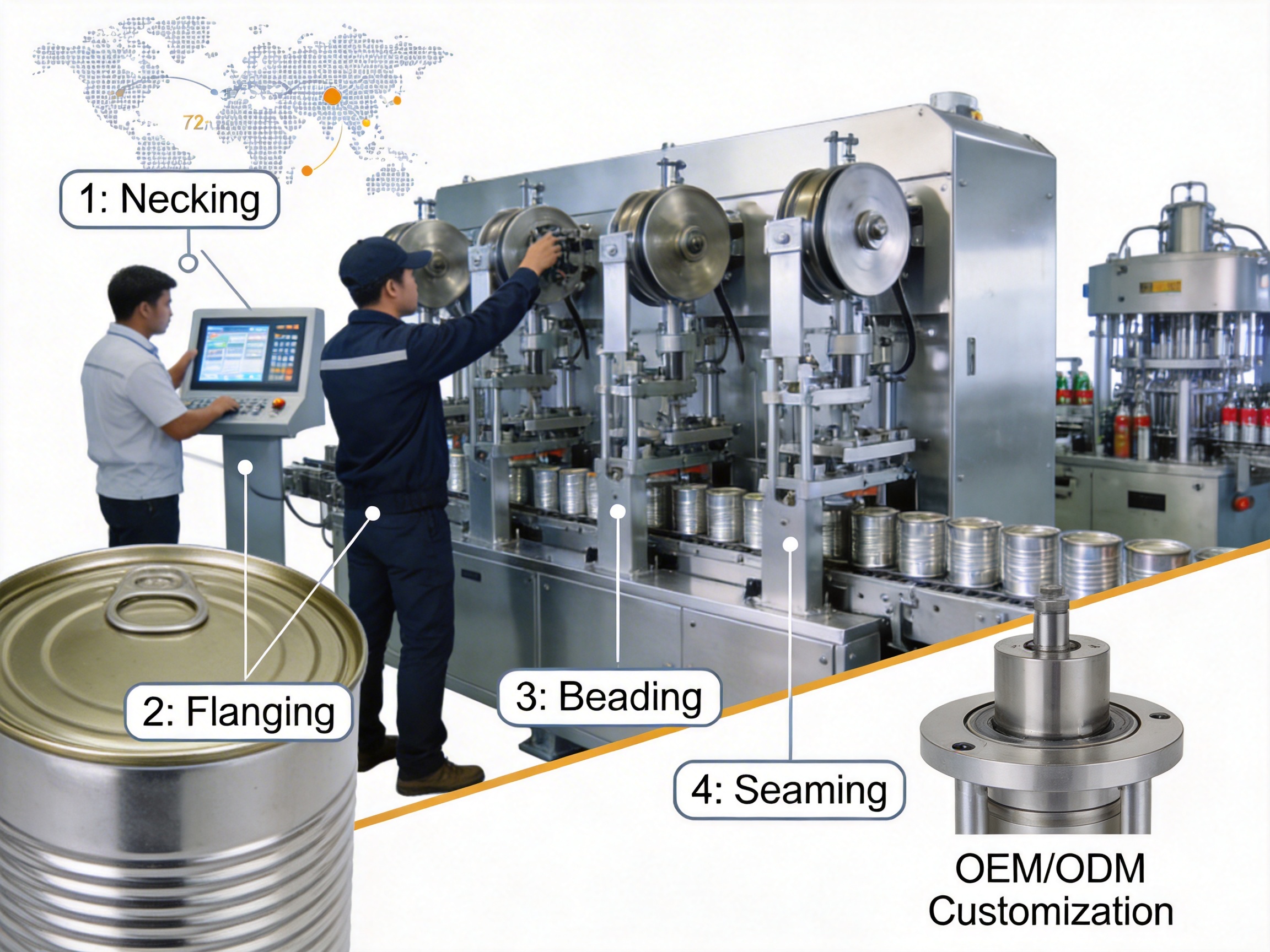 Let’s break down each station’s role: 1. Necking Station: Reduces the diameter of the can’s top (or bottom) to create a narrow neck, essential for attaching lids (like EOE lids for beverages) and ensuring a tight seal. Advanced necking heads (up to 8 heads in some models) enable precise, consistent reductions without deforming the can body. 2. Flanging Station: Forms a small, outward-facing rim at the necked end of the can. This rim secures the lid during seaming, as it provides a surface for the lid’s curl to interlock with. Precision is key here to prevent leaks or lid detachment. 3. Beading Station: Adds small indentations (beads) around the can body to enhance structural integrity, allowing cans to withstand pressure (e.g., carbonated beverages) and prevent collapse during handling. Beading also improves aesthetic appeal. 4. Seaming Station: Attaches the lid to the flanged can body using a double seam—a hermetic seal that keeps contents fresh and contamination-free. Extreme precision is required to avoid over-seaming (cracking lids) or under-seaming (leaks).
