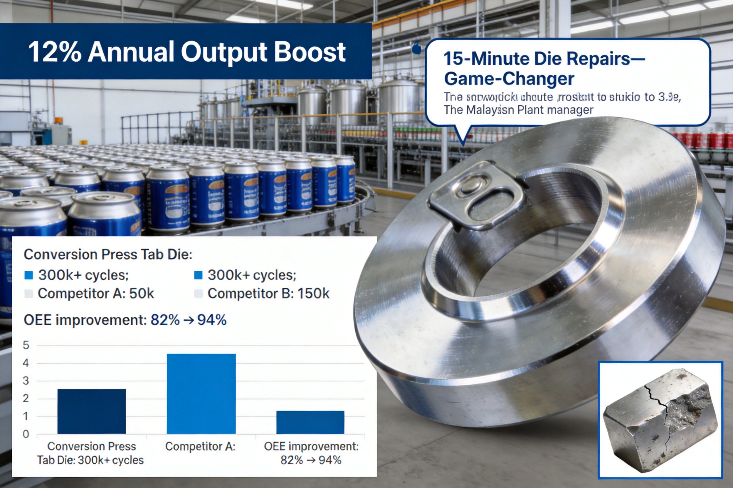 A leading beverage can manufacturer in Germany was struggling with frequent die failures in their conversion presses, leading to 12+ hours of unplanned downtime per month. They switched to the Conversion Press Tab Die (Bulk) in 2022. Within six months, their unplanned downtime dropped to 2 hours per month—a 83% reduction. Additionally, their spare parts costs decreased by 45% because they no longer had to replace full die sets. The factory’s Overall Equipment Efficiency (OEE) increased from 82% to 94%—a significant jump that boosted their annual output by 12%.