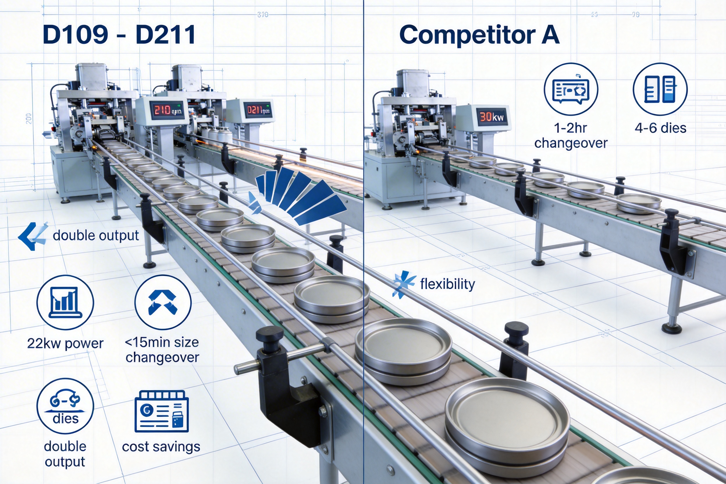To better illustrate the advantages of the 2-lanes D109-D211 line, let’s compare it to a hypothetical competing production line (Competitor A) that is commonly used in the industry: