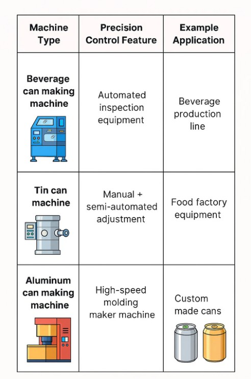 | Molding maker machine | Shapes cans and container bodies | Controls dimensional accuracy and consistency | Beverage cans, custom made cans |