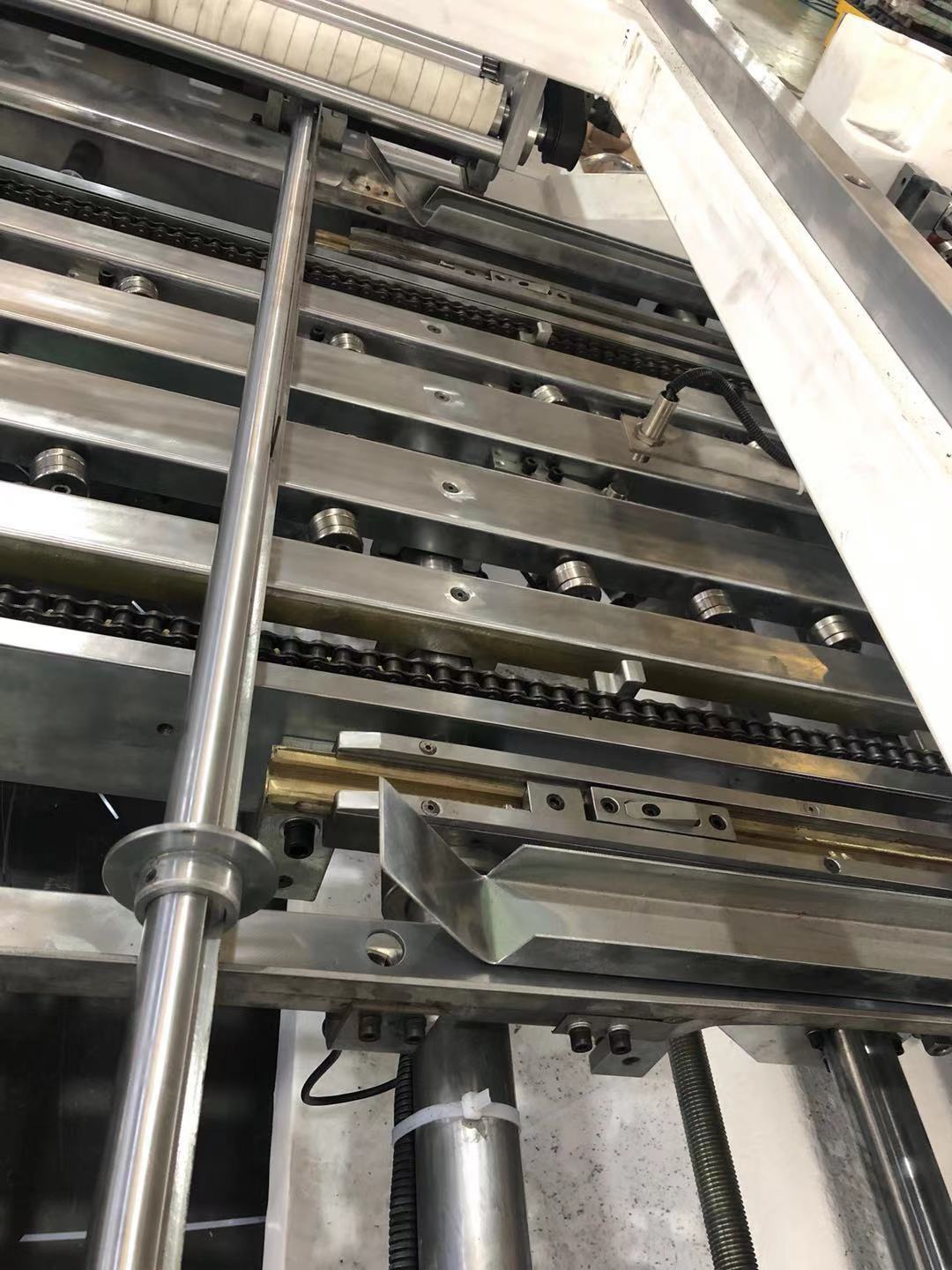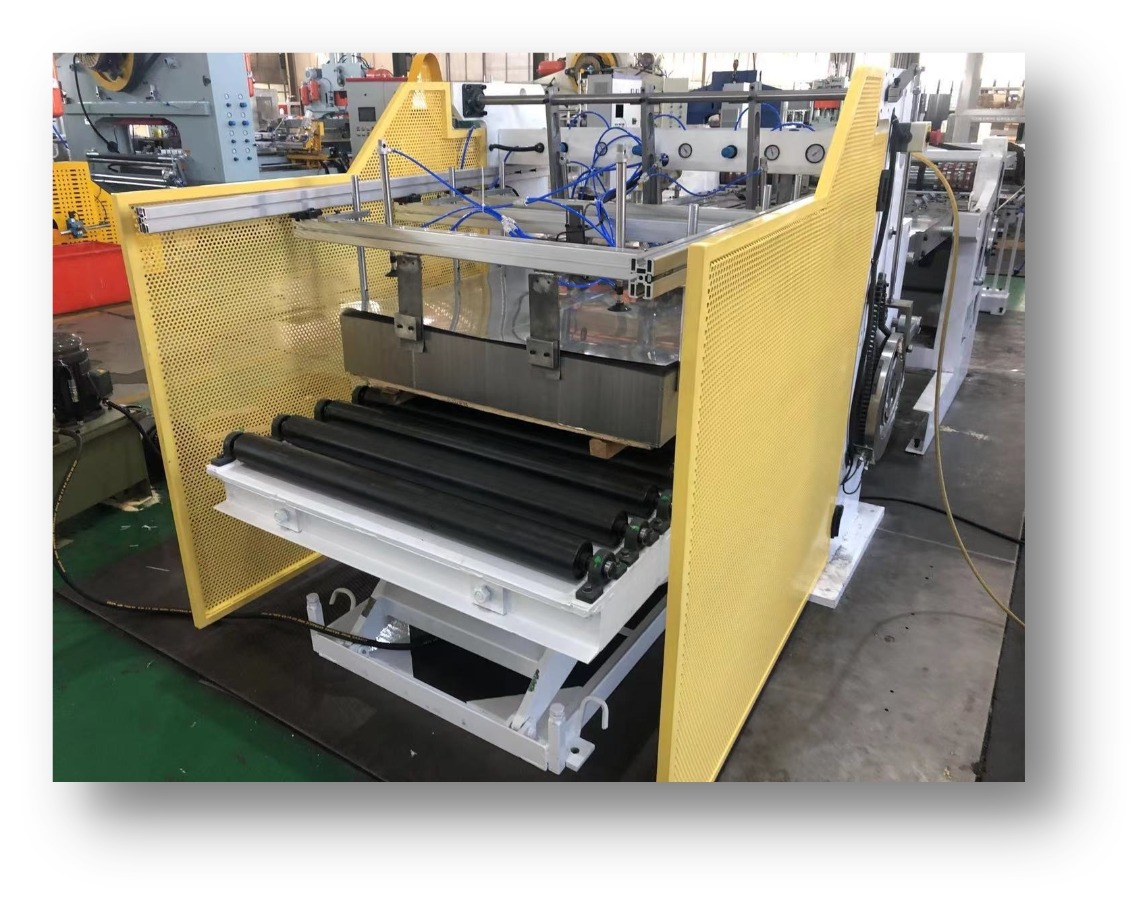 deliver sheets pallet in place → Strong magnets separate sheets → Vacuum suck sheet → Rolling feeding sheet → Double sheet detection (excluding double sheets) →deliver sheet slowly by chain → The first cut → positioning → deliver sheet by chain → Positioning and feeding sheet → collection → inspection