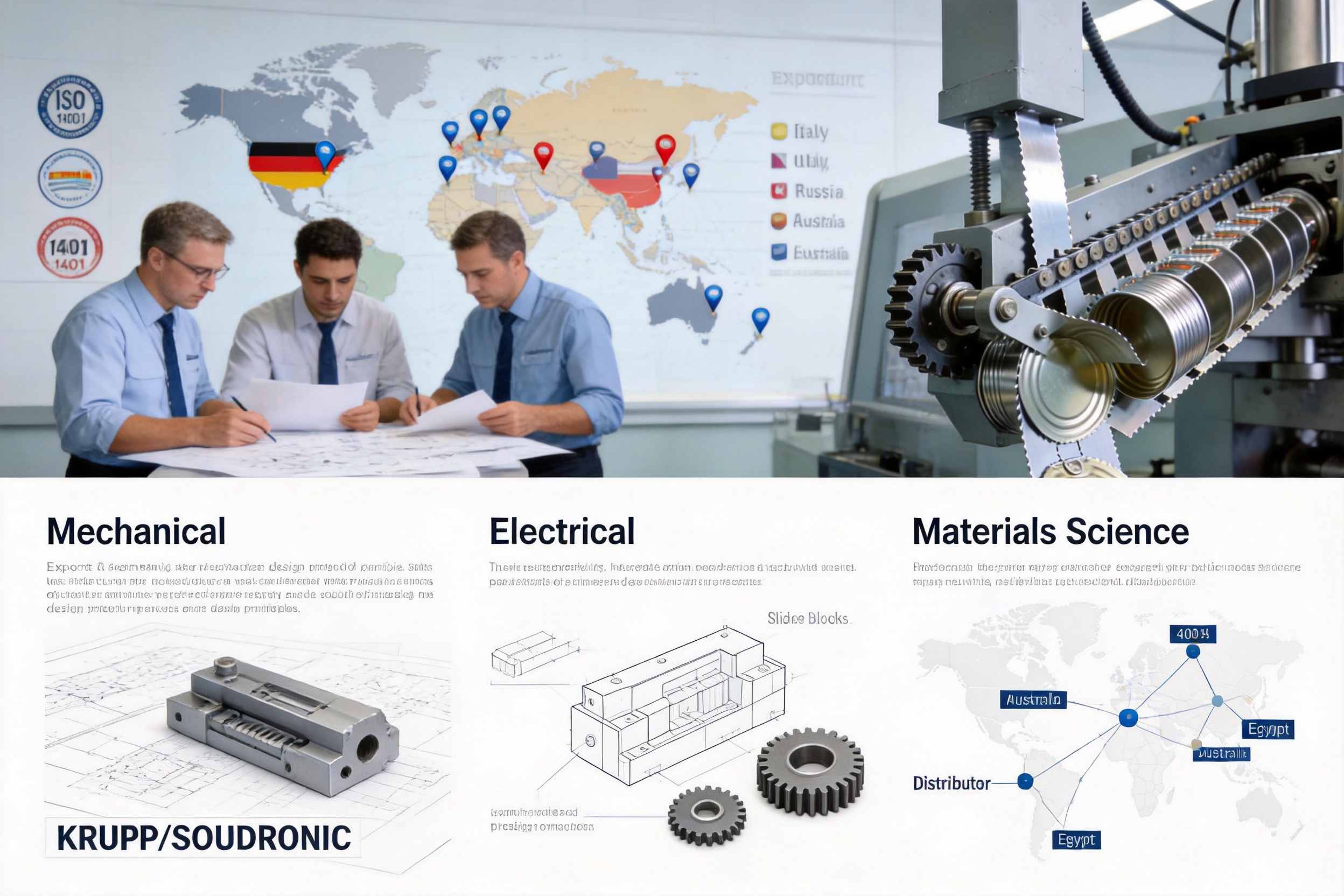 Designs integrate principles from industry leaders (KRUPP, SOUDRONIC, ALFONS-HAAR) known for industrial machinery and can-making expertise. The company innovates by combining these principles with local practical experience, creating more efficient machines.